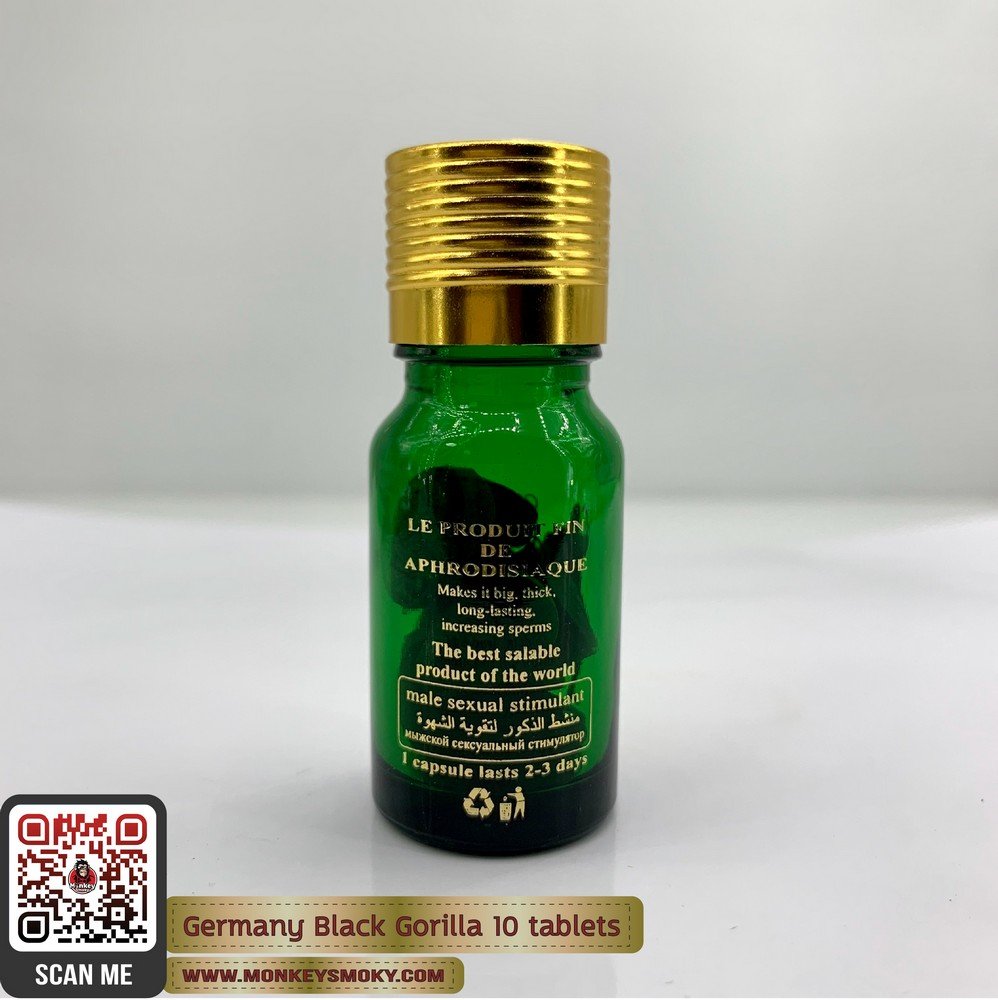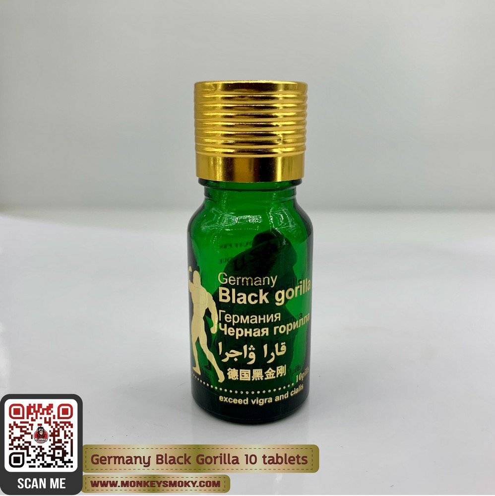 Germany Black Gorilla เป็นยาสมุนไพรที่ช่วยเพิ่มการตอบสนองทางเพศ ใช้รักษาหรือแก้ปัญหาในผู้ป่วยที่มีอาการหย่อนสมรรถภาพทางเพศและมีความต้องการทางเพศต่ำ อ่อนแรงกลางคัน อวัยวะเพศชายสั้น อาการวิ่งเวียนศรีษะ หูอื้อ และโรคต่อมลูกหมาก ยาเม็ดแบล็คกอริล่ายังมีประโยชน์ อย่างมากในการเพิ่มการไหลเวียนของเลือดไปยังองคชาต ซึ่งช่วยในการปรับปรุงสมรรถภาพทางเพศในองคชาต ตัวยามีอายุการเก็บรักษา 3 ปี และควรจัดเก็บในที่แห้งและเย็น ไม่ควรโดนแสงแดด